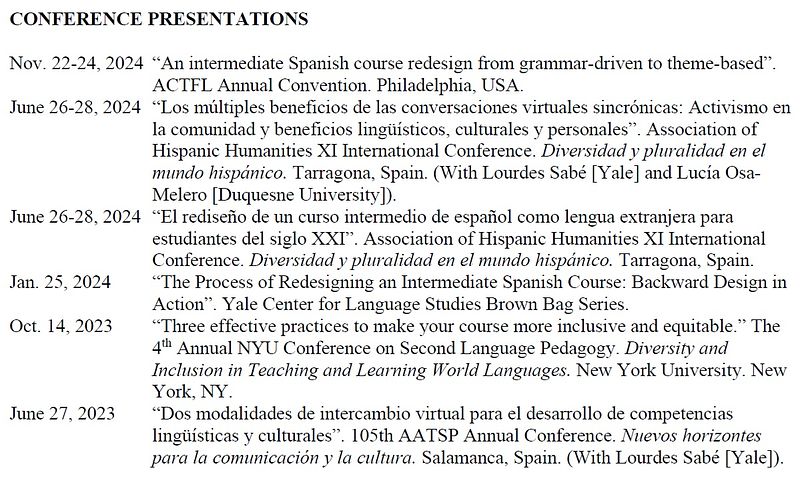 I have also kept an active role in presenting at approximately 18 national and international conferences, such as AATSP or ACTFL, on topics such as course redesign, the use of Virtual Exchange, neurolinguistics, and children's literature. I have also presented at the Yale Center for Language Studies a few times and at my own department for my colleagues. For a detailed list of these presentations, please see my CV. Here is a list of the most recent ones.